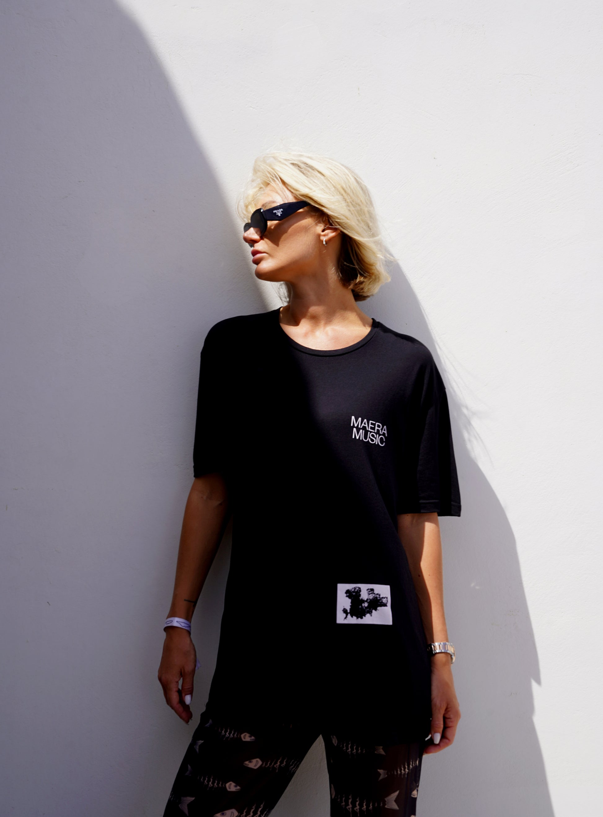 • White silk print of a bold Mykonian sunrise on the back, sleek white Maera Music logo and island imagery on the front