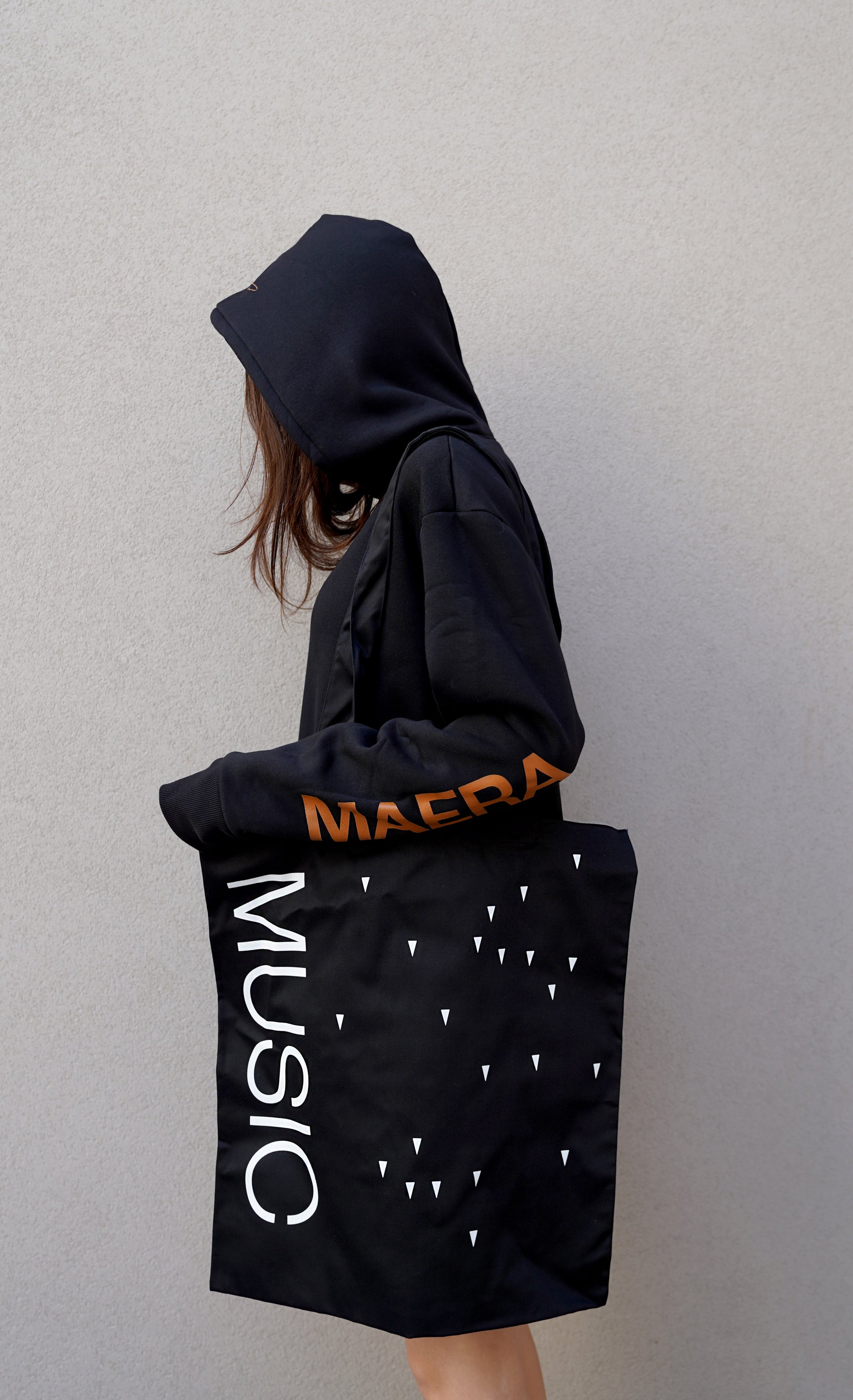 • Bold "MAERA" on one side, "MUSIC" and arrows on the other